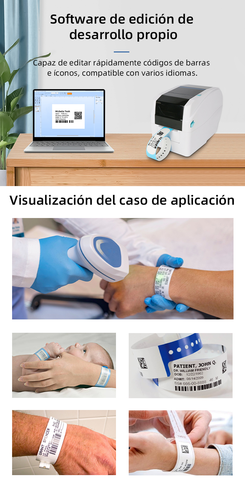 Diseñada específicamente para pulseras, esta impresora de códigos de barras para pulseras ofrece una versátil tecnología de impresión dual, compatible con los métodos de impresión térmica directa y transferencia térmica. Esta flexibilidad le permite elegir la solución más rentable y adecuada para sus necesidades, desde pulseras para eventos de corta duración hasta pulseras y brazaletes impermeables de larga duración que resisten la abrasión y la decoloración. La impresora de etiquetas de pulsera está optimizada para soportes de pulsera estándar, compatible con rollos de papel con un diámetro exterior de hasta 127 mm y un ancho de impresión de 26 mm a 54 mm, lo que garantiza su compatibilidad con una amplia gama de tipos de pulseras.